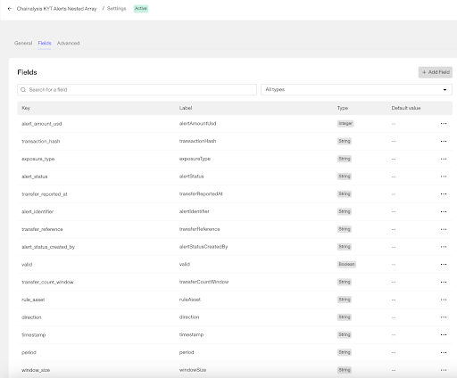 Note: While your schema can include other fields, these are the fields that are required to register a transaction within Chainalysis.