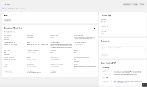 With the Know Your Transactions (KYT) integration powered by Chainalysis, organizations can now streamline crypto monitoring and investigations directly within the Persona platform. Crypto transfers can be registered in Chainalysis, and alerts triggered in Chainalysis can automatically generate Cases in Persona.