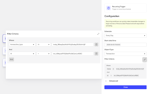 Note: These steps require the use of a similar Transaction Type outlined above in How to register a Transfer, a Case Template with a specific field schema, and a Workflow with a Recurring trigger.