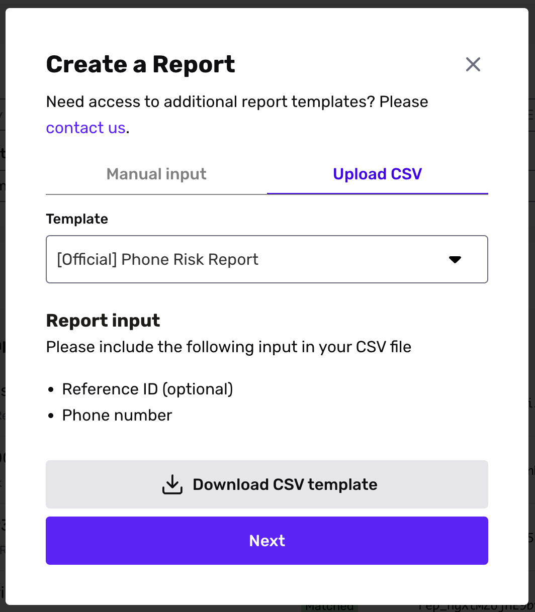 You can create reports in bulk by uploading a CSV of information (individual names, business names, email addresses, phone numbers, etc.). To learn more about different ways to run Reports, read here.