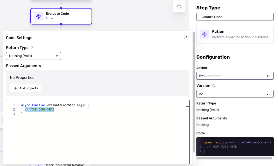 You can find the Evaluate Code Step within Workflows when configuring a new action step.