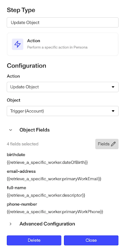 Persona can retrieve worker records and associated profile details using Workday’s API. See below for the available Workflow Action steps and possible configurations for the Workday integration: