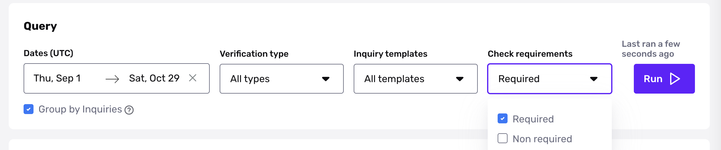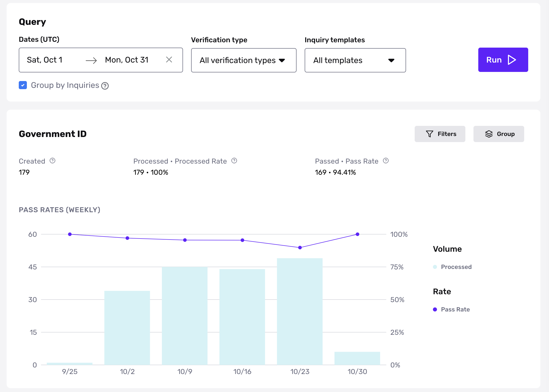 Select a date range to get started, then specify a specific verification type and/or inquiry template from the drop-down menu. Please note that when “Group by Inquiries” is selected, this will capture the most recent verification result within an inquiry.