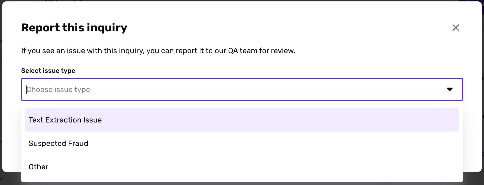 To report incorrect text extraction within the Inquiry, select "Text Extraction Issue".