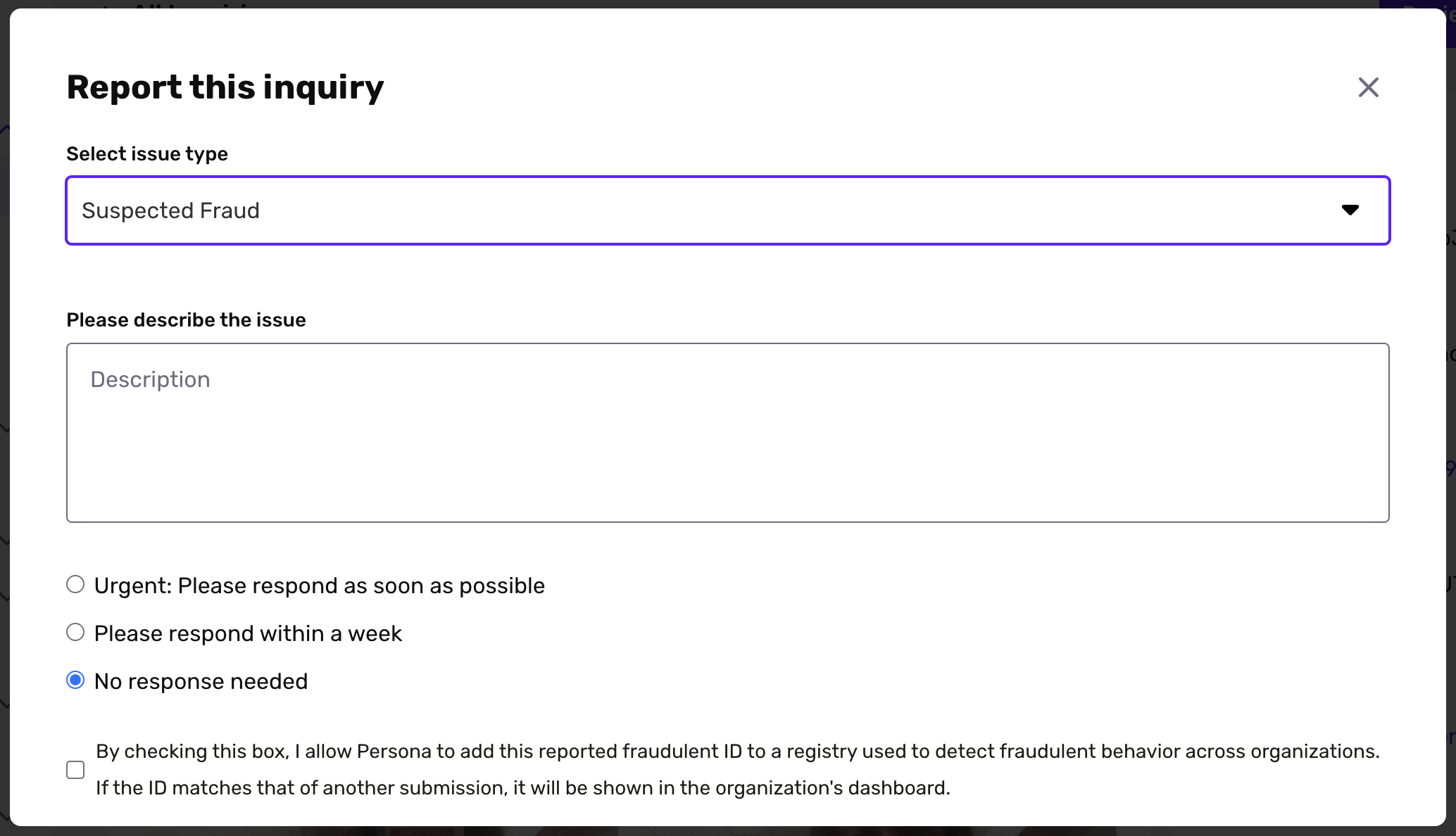 To report extraction errors, suspected fraud, fake identity information, or any other issues related to an Inquiry to Persona, use the "Report issue" button within any Inquiry in a Production environment.