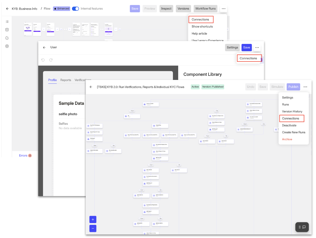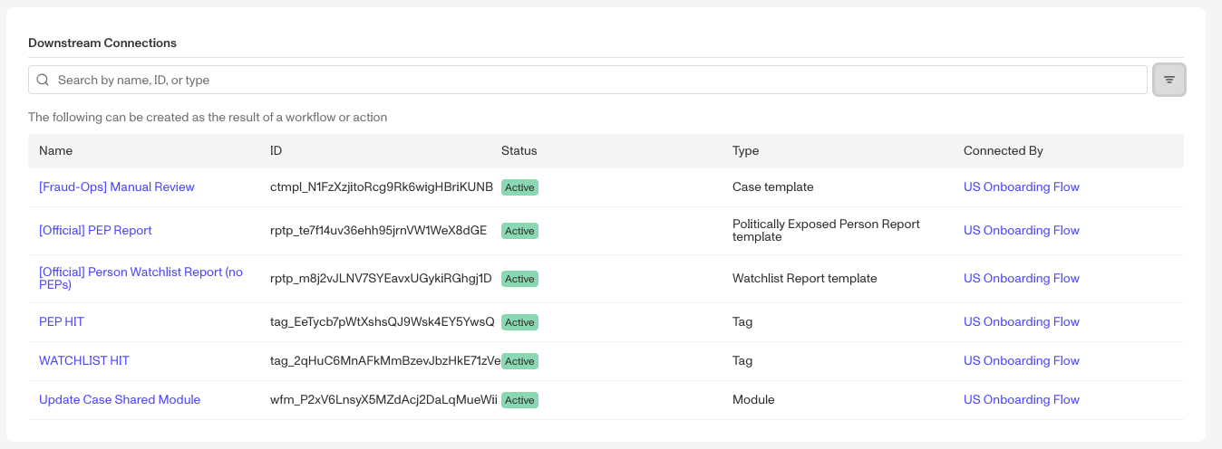 Platform Connections are available for the latest published version of Inquiry Templates, Verification Templates, Case Templates, Report Templates, Graph Query Templates, Account Types, Transaction Types, Tags, Workflows and Lists.