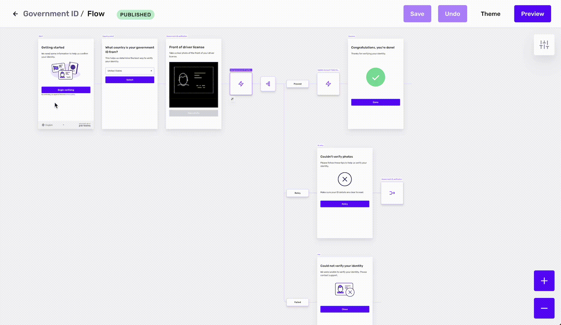Government ID verification is just one example - each verification type has its own configurable options. This section displays all available configurations for each verification type in your inquiry flow.